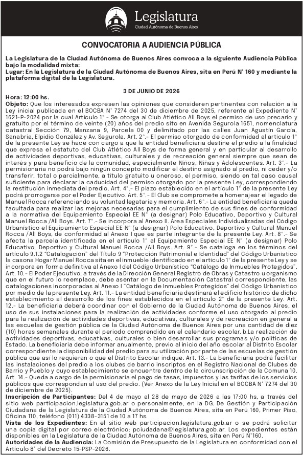 Inscripción de Participantes: Del 4 de mayo al 28 de mayo de 2026 a las 17:00 hs, a través del sitio web participacion.legislatura.gob.ar o personalmente, en la DG. De Gestión y Participación Ciudadana de la Legislatura de la Ciudad Autónoma de Buenos Aires, sita en Perú 160, Primer Piso, Oficina 110, teléfono (011) 4338-3151 de 10 a 17 hs.