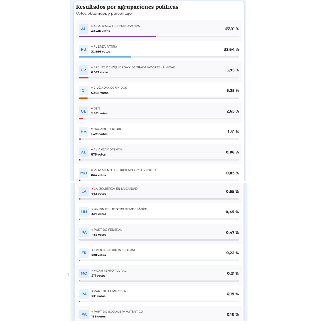 La alianza La Libertad Avanza obtuvo 44.517 votos, equivalentes al 45,19 % del total, ubicándose como la fuerza más votada. En segundo lugar se posicionó Fuerza Patria, con 28.521 votos (28,95 %), mientras que el Frente de Izquierda y de Trabajadores – Unidad (FIT-U) alcanzó el 9,85 % (9.711 votos).