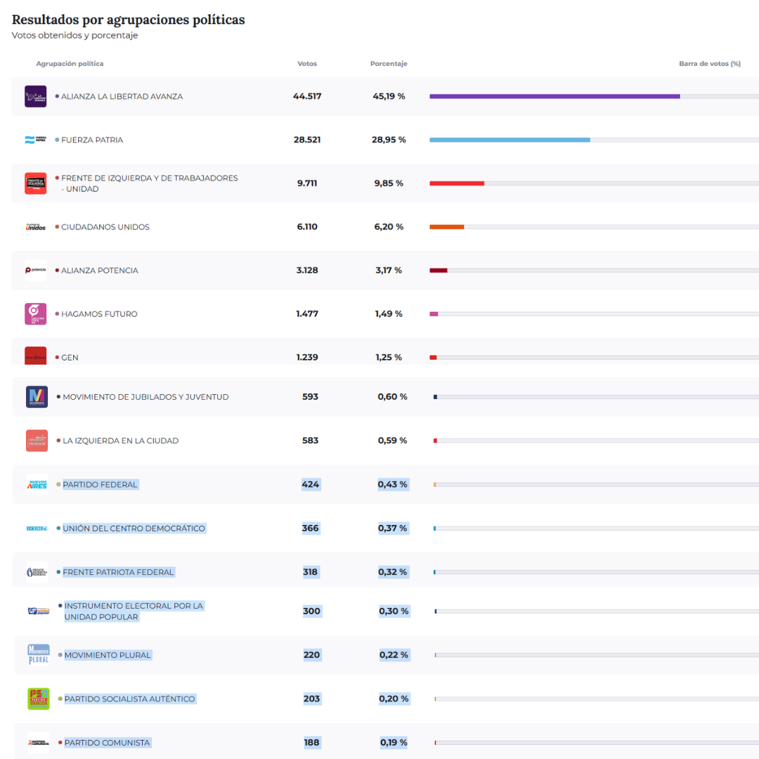En la categoría para senadores nacionales, La Libertad Avanza amplió aún más su ventaja, alcanzando el 47,91 % de los votos (48.416 sufragios), más de 15 puntos por encima de Fuerza Patria, que obtuvo 32,64 % (32.986 votos).