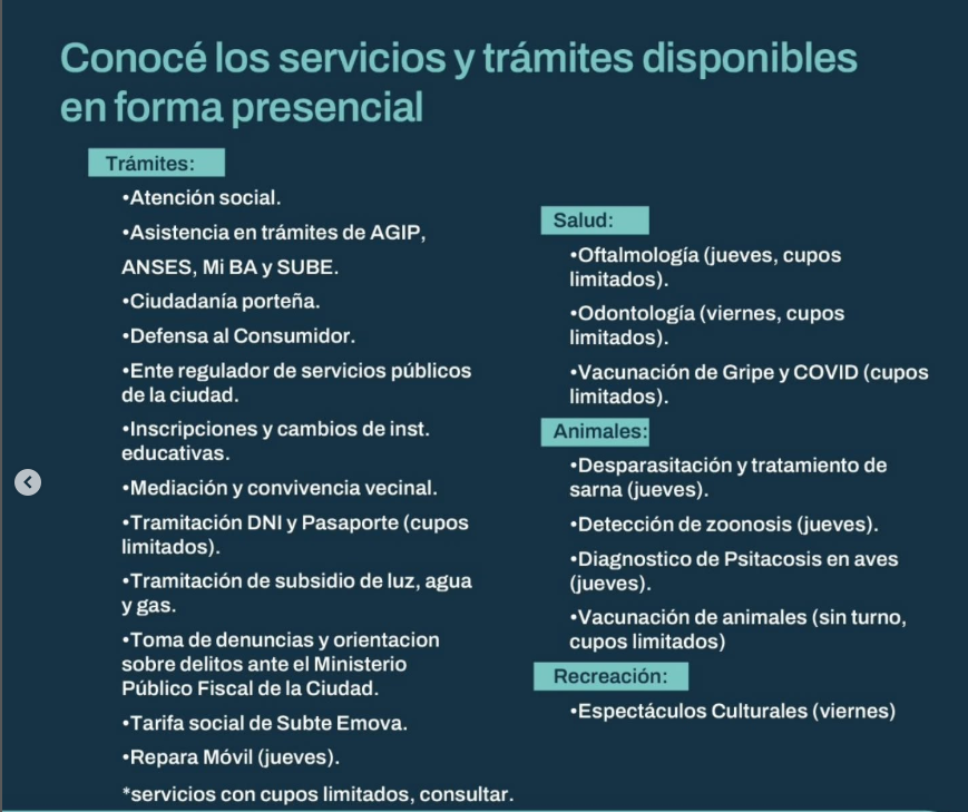 También se podrán realizar trámites, entre los que se destacan: Tramitación de DNI y pasaporte; Tarifa social de subte, tramitación de subsidios para luz y gas, y Ciudadanía porteña, entre otros