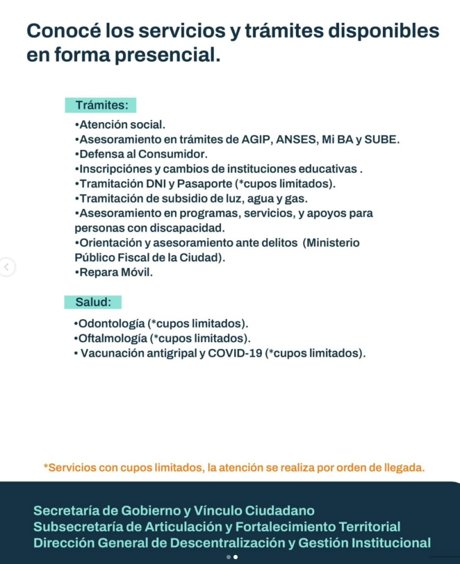 También se podrán realizar trámites, entre los que se destacan: Tramitación de DNI y pasaporte; Tarifa social de subte, tramitación de subsidios para luz y gas, y Ciudadanía porteña, entre otros