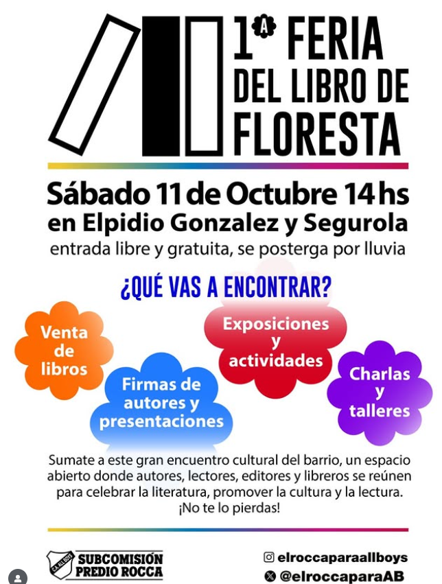Con más de 30 puestos confirmados, el evento promete. Con la misma consigna de “el Rocca para All Boys” ya se han hecho recitales, presentaciones sobre historia y muestras de deportes amateurs que ofrece el club de Floresta. Ahora, la idea de la feria del libro se impone y acerca la cultura al barrio: se junta la oferta de una gran cantidad de autoras y autores en la comodidad de lo vecinal.